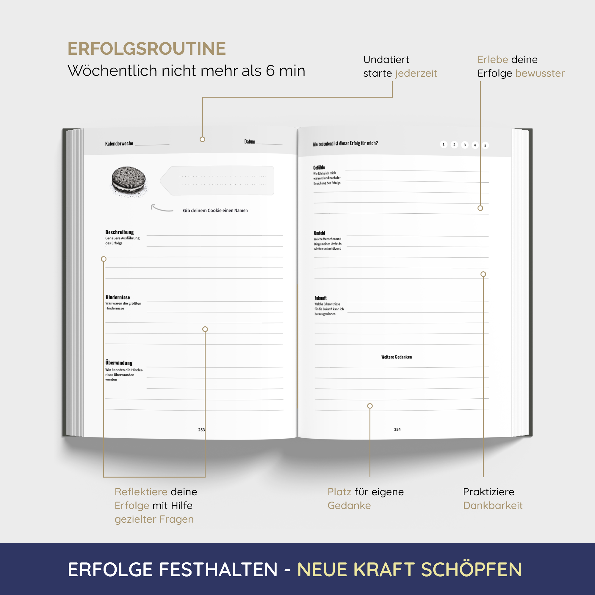 Unser Erfolgsjournal geht über berufliche Erfolge hinaus und unterstützt dich dabei, persönlich zu wachsen und dein Wohlbefinden zu steigern. Es ist der Schlüssel zu einem ausgewogenen und erfüllten Leben. Wenn du viel um die Ohren hast, ist unser Journal perfekt für dich. In nur 10 Minuten pro Woche kannst du deine Ziele vorantreiben, ohne deine wertvolle Zeit zu beanspruchen. Diese minimalistische Investition führt zu maximalen Ergebnissen – du steigerst deine Produktivität und erzielst bedeutende Fortschritte auf dem Weg zu deinen persönlichen Zielen.